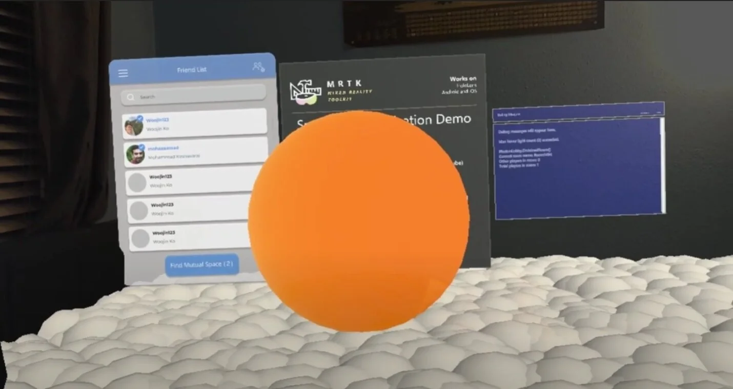 The introductory UI of the experience is a menu which allows the user to select which of his friends he would like to share a mutual space with; once selected, the algorithm will calculate the mutual space and display it on the hololens.